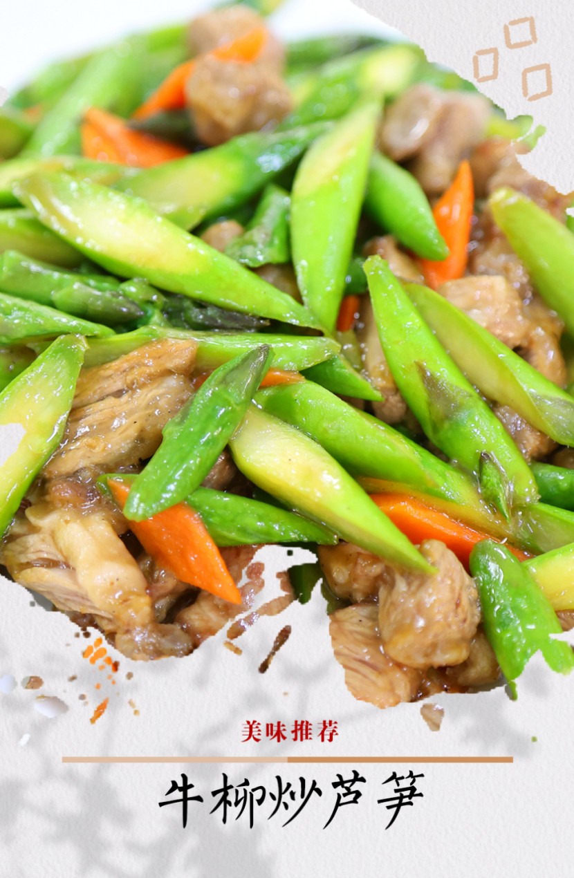 牛柳炒芦笋:牛肉15g、芦笋30g、胡萝卜10g;